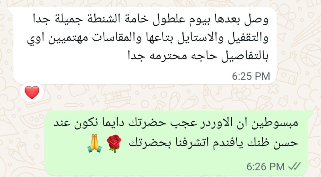 الاوردر وصل والخامة جميلة والتقفيل ممتاز والمنتج اللي وصل نفس المنتج المعروض على الصفحة وفي سرعة في توصيل الاوردر بالتوفيق دايما إن شاء الله