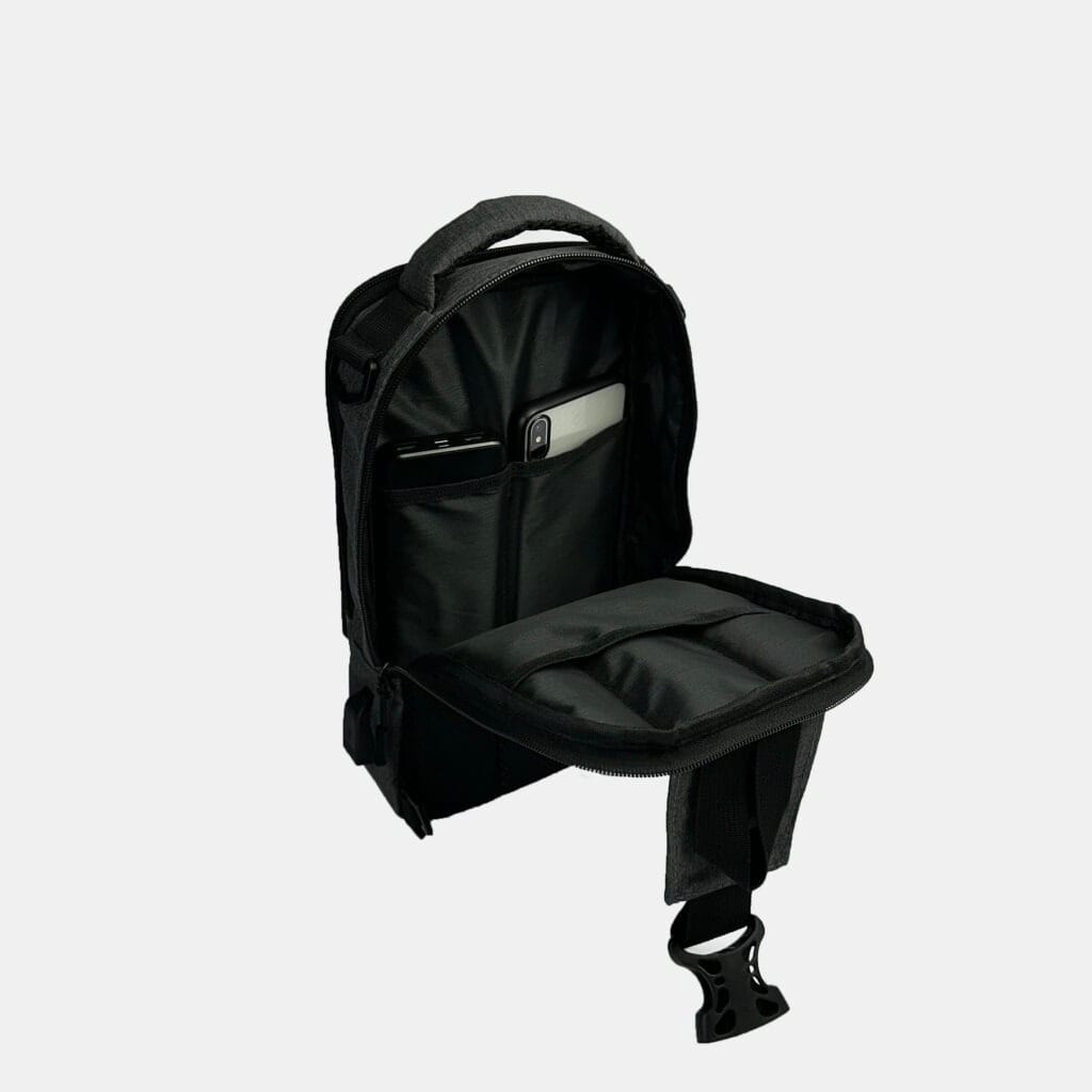 – جيب رئيسي واسع يحتوي على مكان مخصص للهاتف، الباور بانك، وزجاجة مياه 600 مل